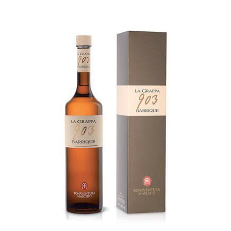 Il numero 903 in etichetta riporta alla mente la data di nascita di Bonaventura Maschio, fondatore dell’azienda di Gaiarine; di colore ambrato, tipico dell’affinamento in barriques, al naso ci accoglie con sentori speziati, fiori secchi, frutta candita, tabacco e vaniglia. Al palato è armoniosa, ben strutturata, morbida, con chiusura su richiami di tostatura. Gradazione 40%.